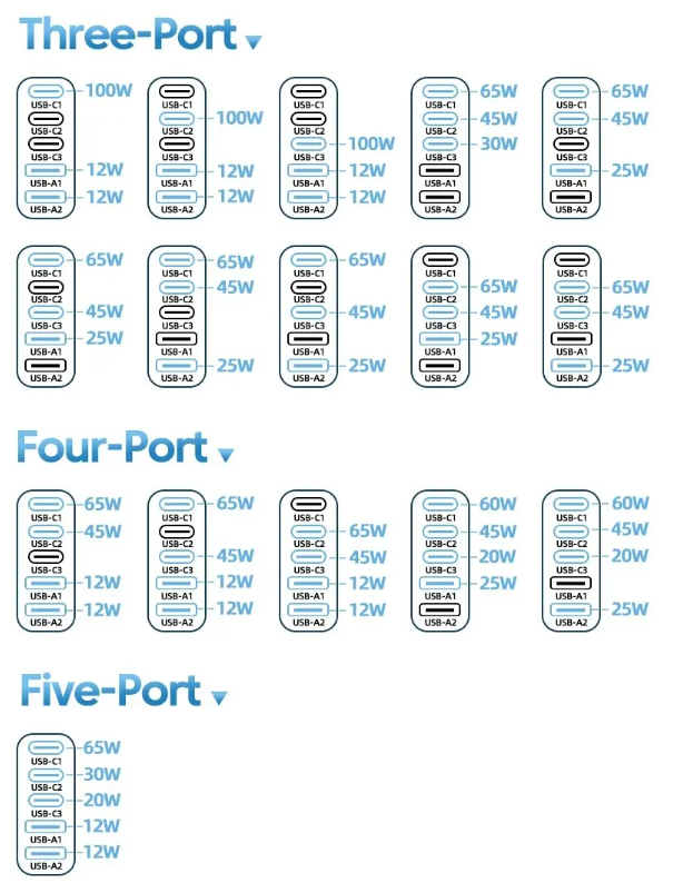 포트는 총 5개로 C타입 포트 3개 A타입 포트 2개가 있습니다.