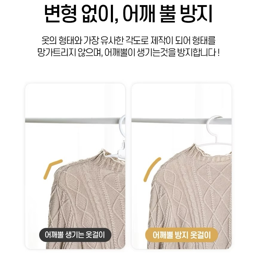 어깨가 뭉쳐서 옷이 망가지는 걱정, 이제 그만! 이 옷걸이는 옷의 형태에 맞춘 라운드 디자인으로 되어 있어서, 어깨뿔을 방지해줘요. 니트나 셔츠 등도 항상 깔끔한 형태로 보관할 수 있어요! 💪 옷이 늘어지지 않고, 어깨 부분도 예쁘게 유지돼요!