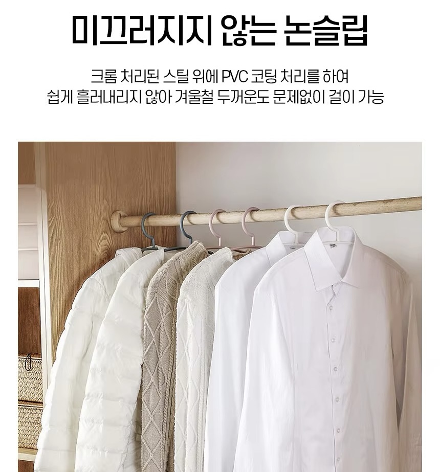 이 논슬립 어깨뿔방지 니트옷걸이의 가장 큰 특징은 바로 미끄럼 방지 기능이에요! PVC코팅이 되어 있어 옷이 흘러내리지 않아요. 겨울철 두꺼운 외투나 니트도 문제 없이 잘 걸어둘 수 있답니다! 😊 이제 더 이상 옷이 떨어지는 일 없어요!